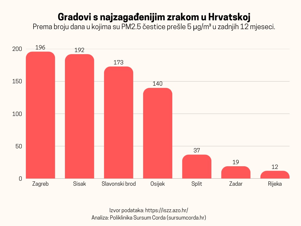 Prema novoj analizi Poliklinike Sursum Corda, napravljene na temelju podataka Ministarstva zaštite okoliša i zelene tranzicije, kvaliteta zraka u najvećim hrvatskim gradovima razlikuje se dramatično. Podaci za posljednjih godinu dana pokazuju da u pojedinim gradovima građani gotovo svaki drugi dan udišu zrak koji prelazi preporučene zdravstvene granice.
