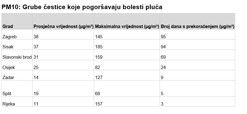 U Zagrebu, Sisku i Slavonskom Brodu građani su tijekom godine imali više od 170 do čak 196 dana s prekoračenjem PM2.5. To znači da gotovo svaki drugi dan u godini udišu opasan zrak. Rijeka, s 12 dana prekoračenja, stoji najbolje, ali čak je i to trostruko više od WHO dopuštenog maksimuma.