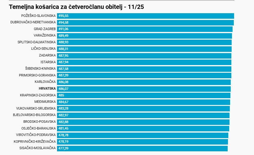 Na nacionalnoj razini, najskromnija prehrana za četveročlanu obitelj uz bazičnu higijenu u studenom je koštala 486,07 eura (+2,51 euro u odnosu na listopad), no regionalne razlike su velike. U Požeško-slavonskoj županiji ista košarica koju nazivamo i “košarica za preživljavanje” koštala je 495,55 eura. Istovremeno je u Sisačko-moslavačkoj županiji bila 18,16 eura jeftinija pa joj je cijena iznosila 477,39 eura.