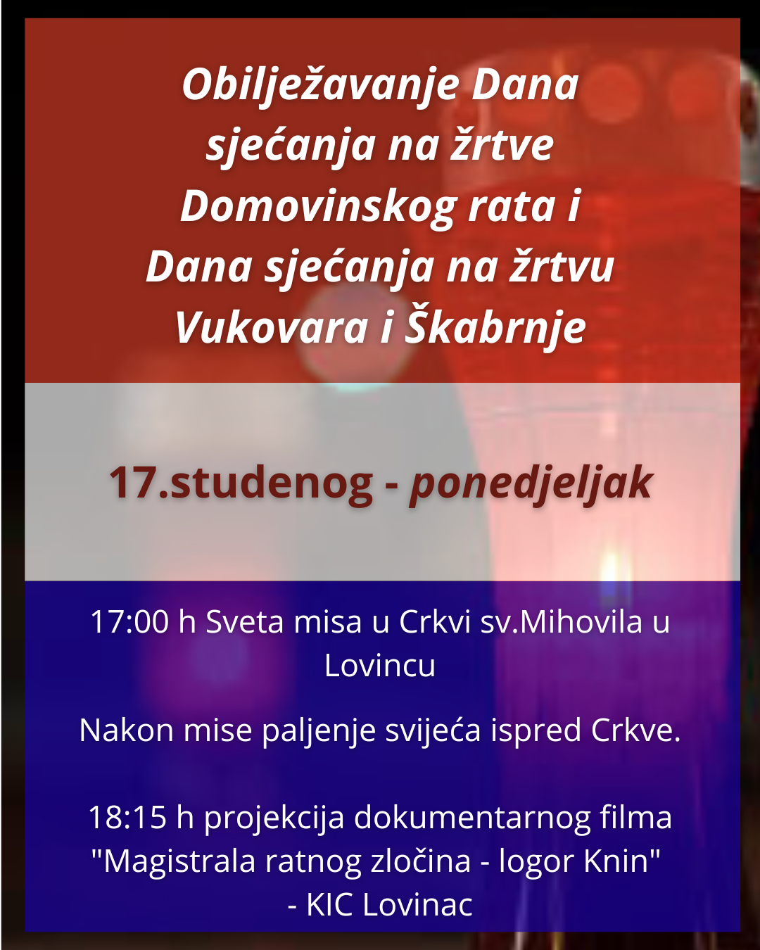 17:00 sati – Služit će se Sveta misa za sve poginule, nestale i stradale u Domovinskom ratu – Crkva sv. Mihovila, Lovinac